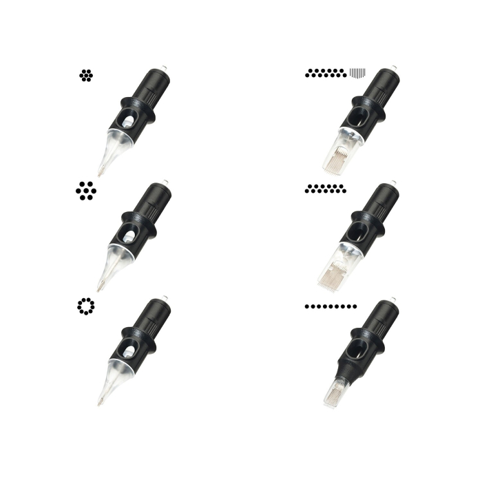 Cheyenne Safety naaldcartidges zijn snel verwisselbaar en hebben hun eigen geïntegreerde membraan, dat inkt en bloed in de cartridge houdt, weg van de grip. De naalden van de cartridge zullen uit het uiteinde van de tip steken als de met veer geladen naaldstang plunjer ingedrukt wordt, en de naalden keren terug naar hun normale startpositie wanneer losgelaten wordt, zodat het veilig is om weg te werpen.