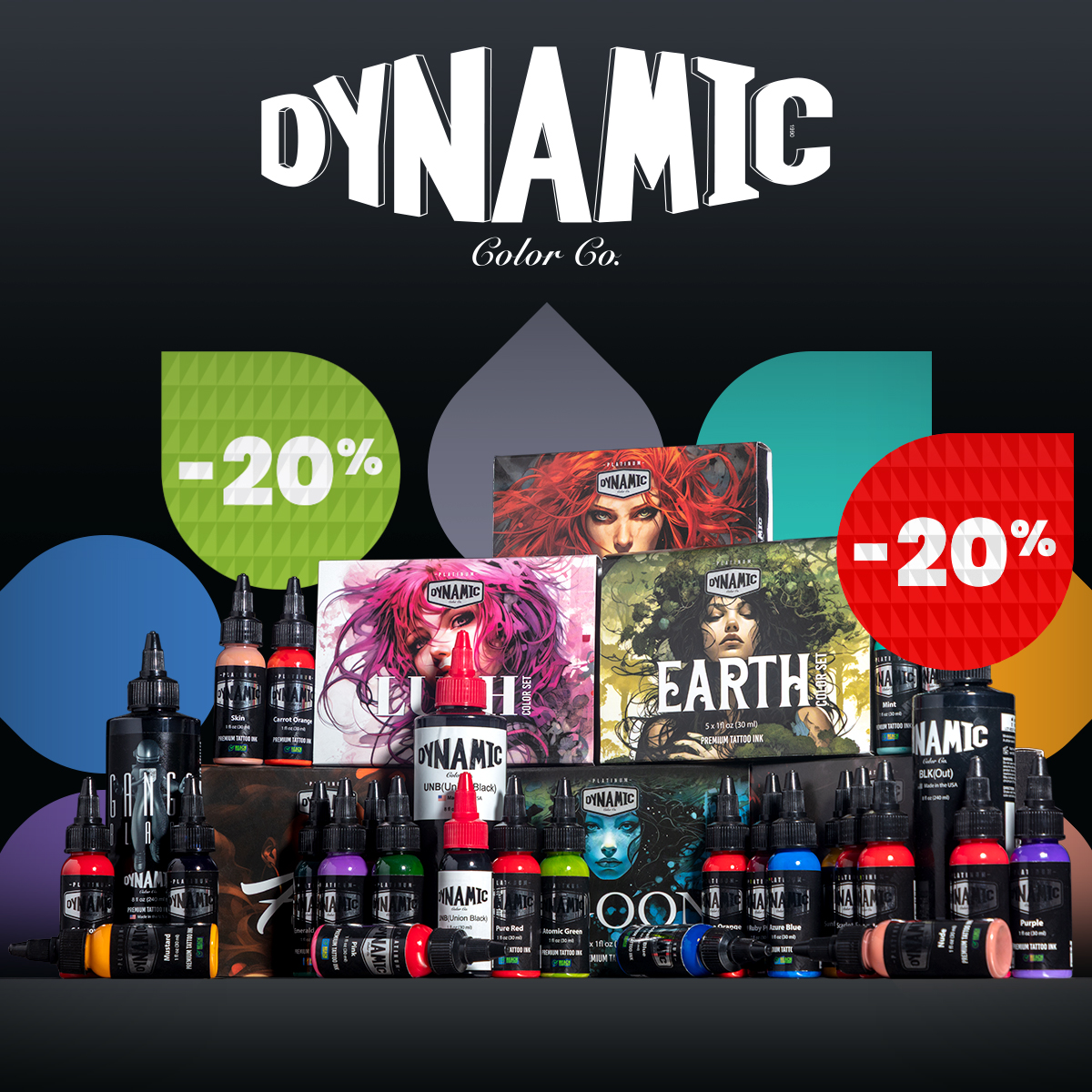 Krijg in april 20% korting op Dynamic Inks, inclusief het EU REACH-conforme Platinum-assortiment en Dynamic PMU Ink!
