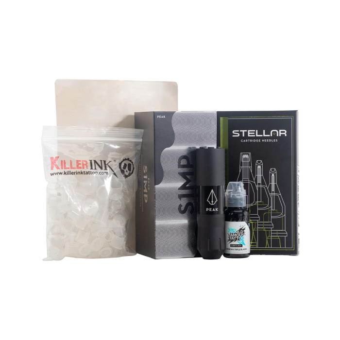 Bevat een pen-stijl tattoo-machine met draadloze batterij, zwarte inkt en inktcups, cartridges en een vel oefenhuid, zodat je meteen kunt beginnen met oefenen. Alles in deze kit wordt afzonderlijk verkocht op de website van Killer Ink, zodat je het naar behoefte kunt aanvullen.